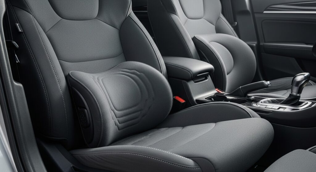 - Lumbar support: Use your car’s adjustable lumbar support—or an accessory cushion—to fill the curve of your lower back. This is crucial for preventing lower back pain, especially during long drives.