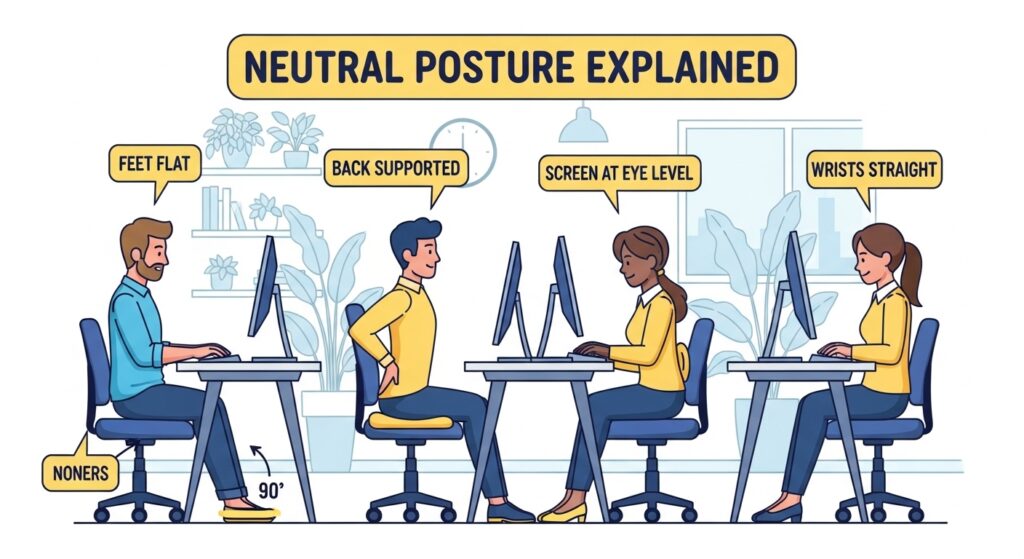 This is why movement is a critical part of neutral posture. Regular posture changes, short breaks, and brief periods of standing or stretching help the body recover and maintain alignment. A commonly used ergonomic principle is that the best posture is the next posture.