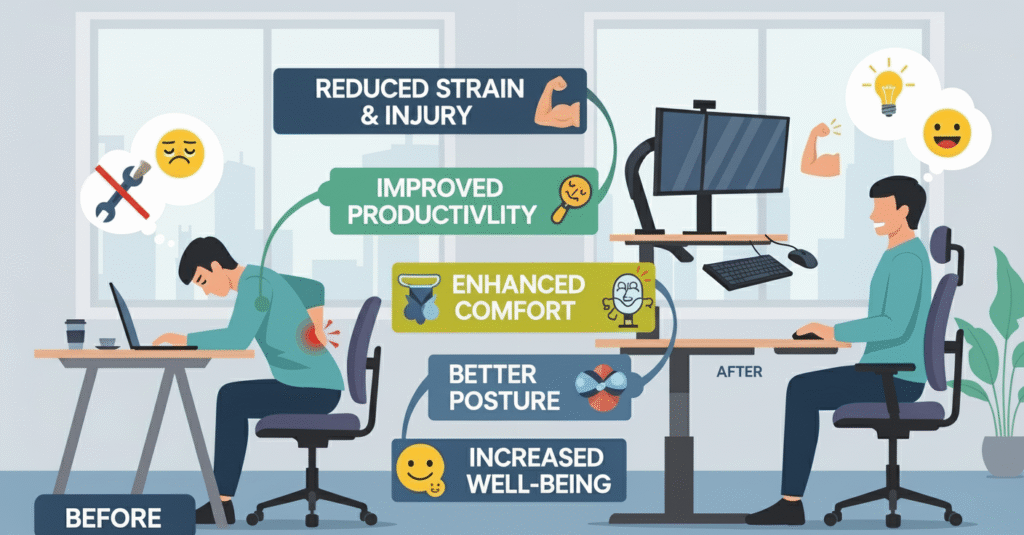 When workplaces prioritize physical ergonomics, everyone wins. Employees feel healthier and more comfortable, while organizations enjoy: