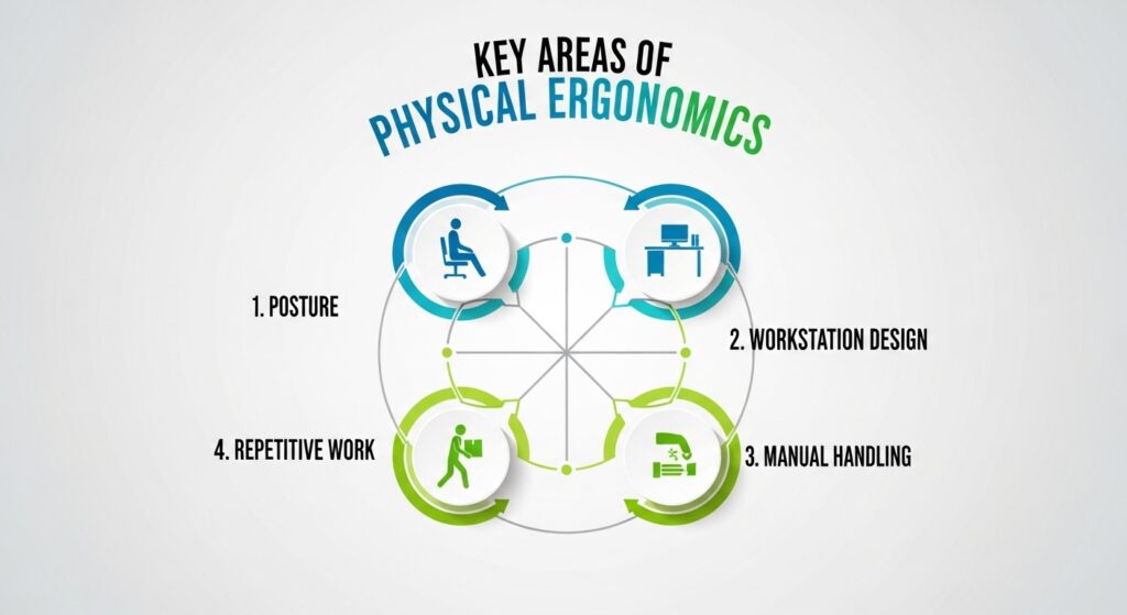 Physical ergonomics is the branch of ergonomics that focuses on the human body’s responses to physical and physiological demands. It looks at posture, movement, workstation design, and how repetitive actions affect our muscles and joints. By improving these aspects, we can reduce injuries, boost productivity, and make work more comfortable.